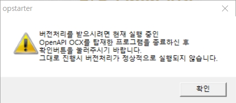 버전처리를 받으라고 메시지가 나온다. 이 때 확인 버튼을 바로 누르지 말고 반드시 KOA StudioSA를 먼저 종료 후 버전처리 메시지의 확인 버튼을 눌러야 한다!!!