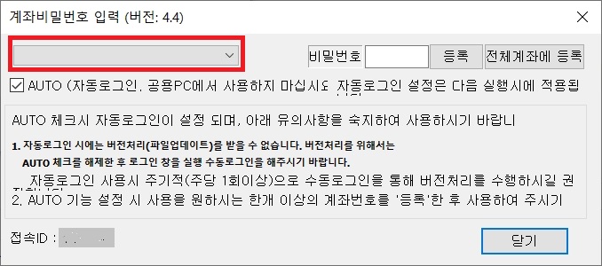 윈도우 화면 오른쪽 아래에 있는 api 아이콘을 선택 후 마우스 오른쪽 클릭해서 계좌비밀번호 저장을 클릭하면 계좌비밀번호를 입력할 수 있는 팝업창이 뜬다.