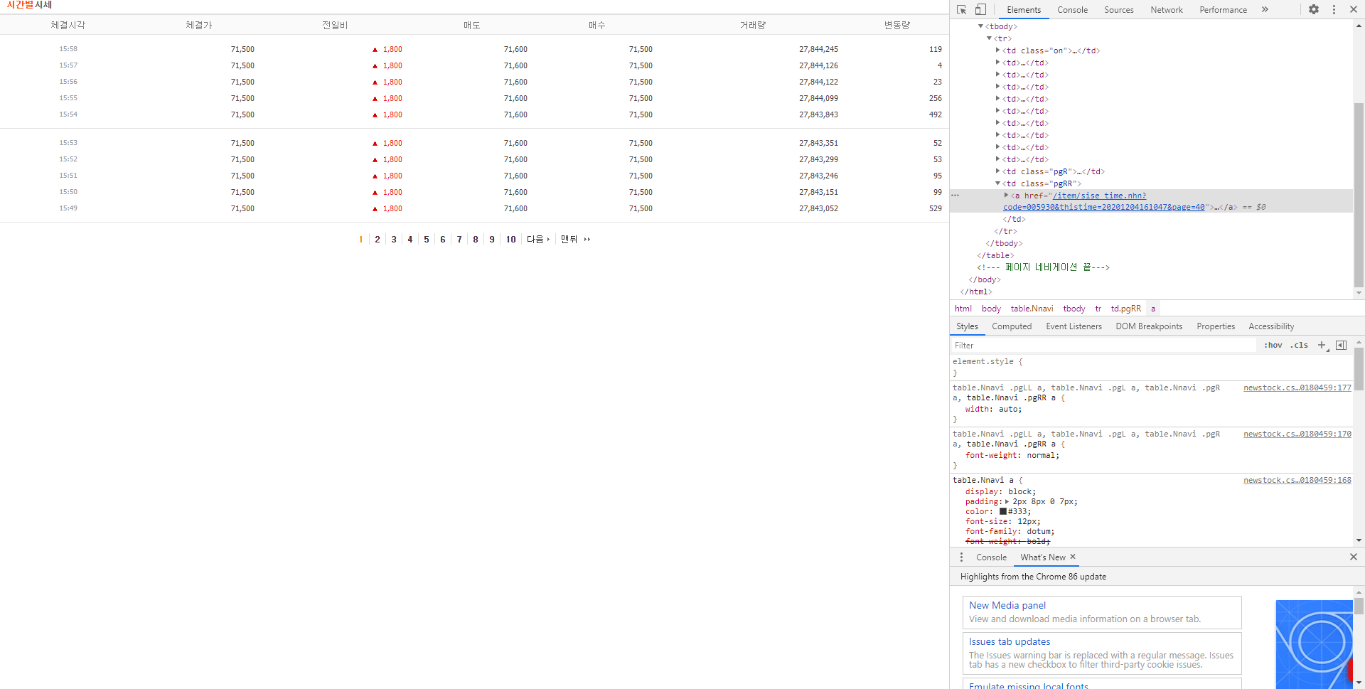 '맨뒤'의 url 주소는 /item/sise_time.nhn?code=005930&thistime=20201204161047&page=40 입니다.