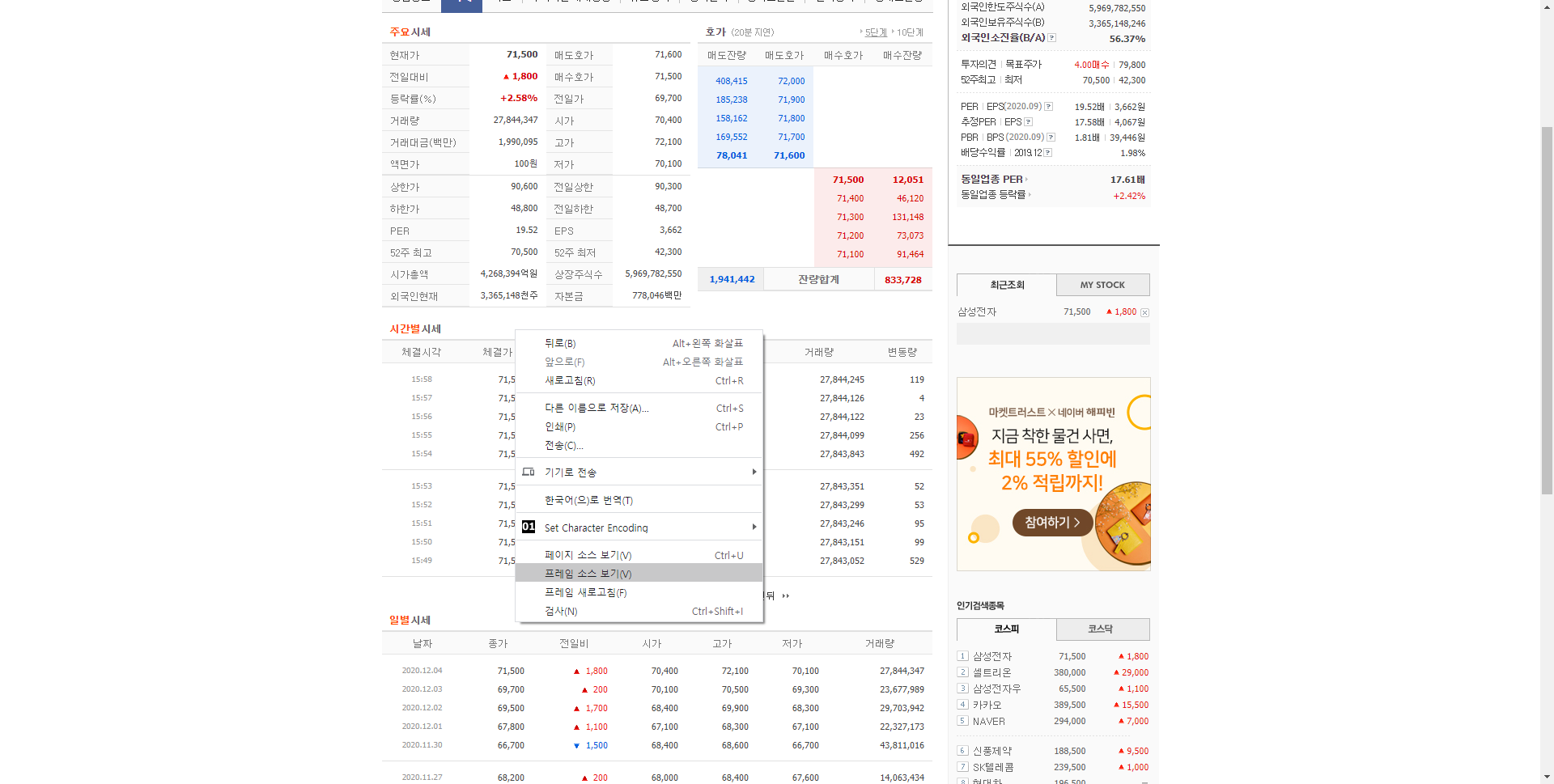 삼성전자(005930)을 조회합니다. 시세 탭을 클릭 후 '시간별 시세'의 데이터가 표시된 곳에서 마우스 오른쪽 클릭하여 프레임 소스 보기를 클릭합니다.