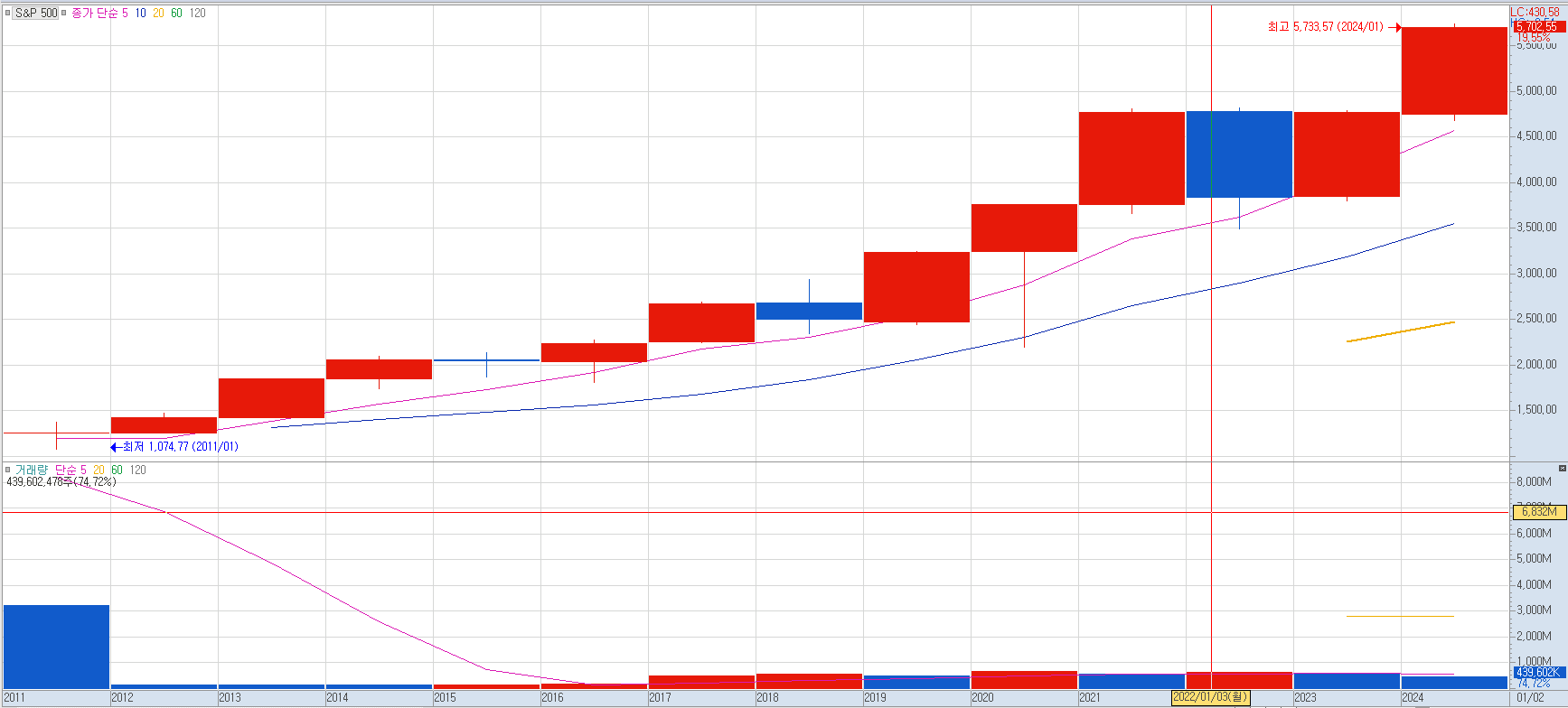 미국 S&P500 2011년부터 현재까지의 연간 차트를 보자.